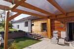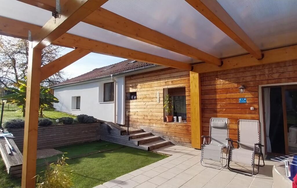 Terrain plat et arboré, terrasse, sud, pergolas bois, jacuzzi.